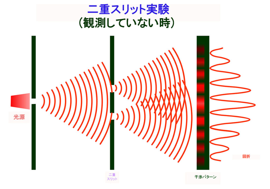 - 観測していないとき:電子は「波」として振る舞い、どこにでも存在する「可能性」の状態にある。